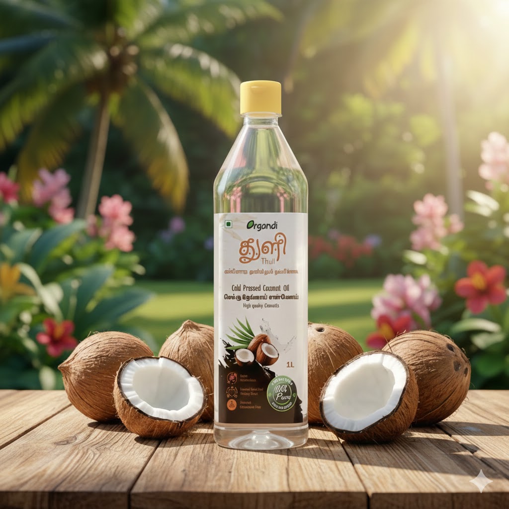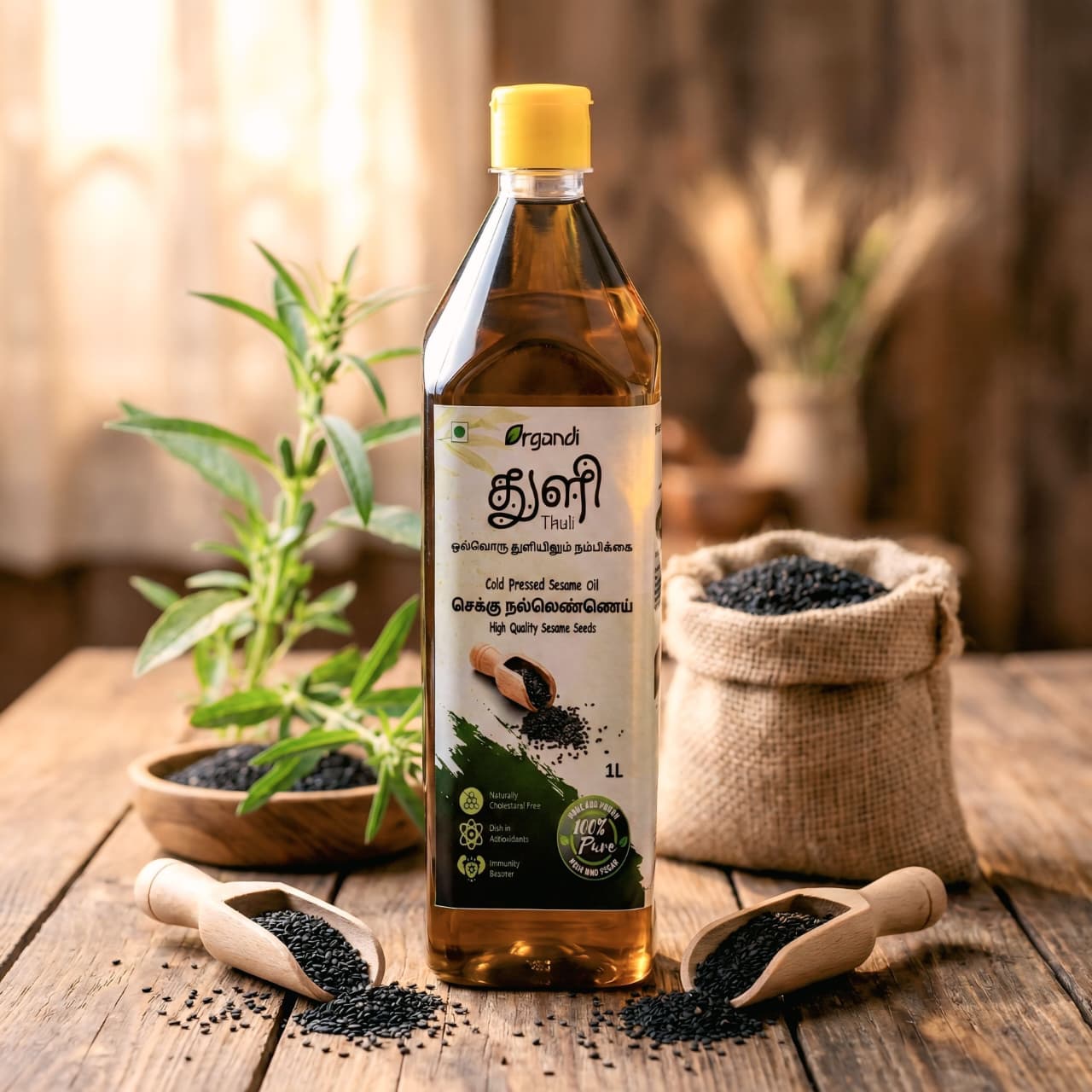 Traditional cold-pressed sesame oil rich in flavor and antioxidants. Ideal for authentic South Indian cooking and healthy living.