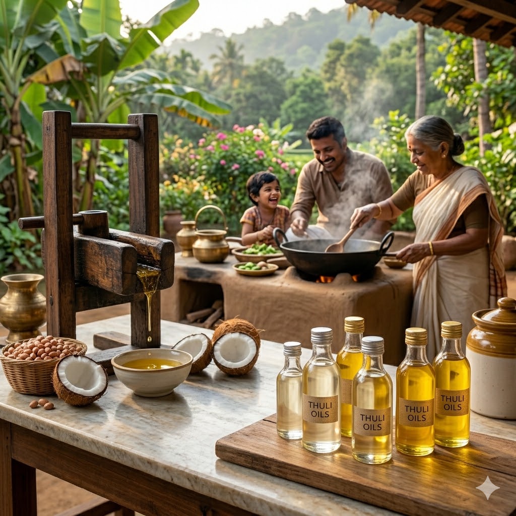 Thuli began in the heart of the southern plains, where the rhythmic creaking of the Chekku (wooden press) was the heartbeat of our village. For generations, we watched as the seeds were transformed not through speed or heat, but through patience and the steady pull of seasoned wood.